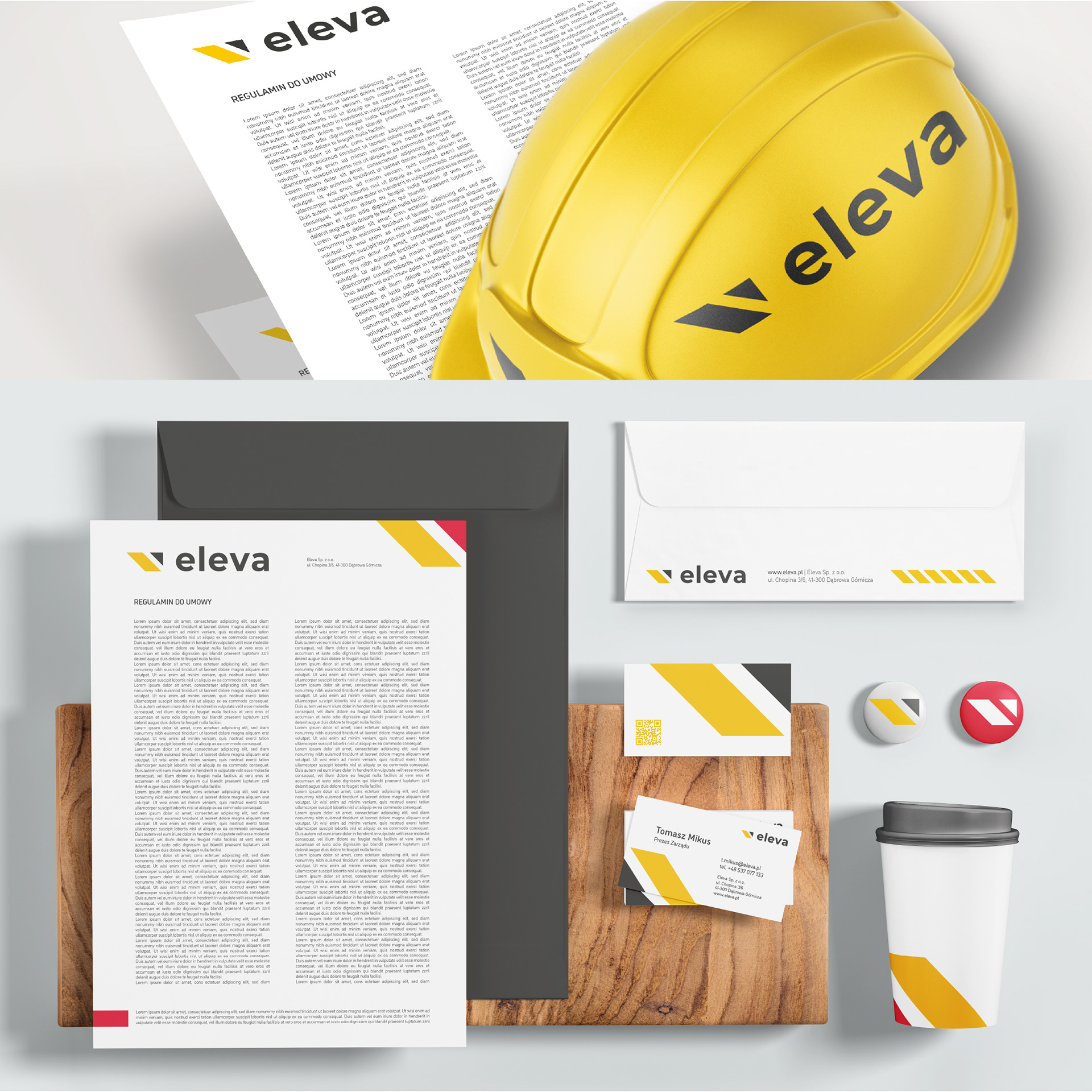The yellow shape not only refers to the client's construction needs but is also a color commonly associated with the industry. The dark triangle shape displays growth progress and development.